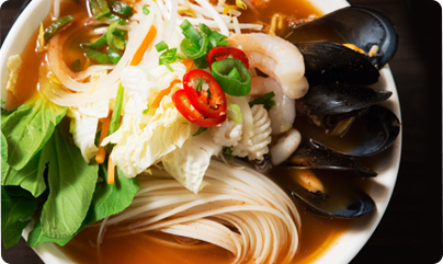 해산물과 신선한 야채가 칠리소스의 육수와 어우러진 매콤하고 시원한 쌀국수