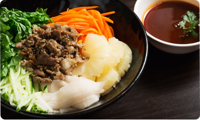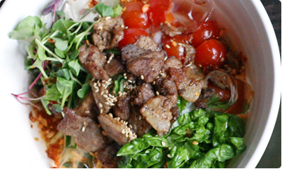 버미셀리면과 각종 야채, 숯불고기를 베트남식매콤한 소스에 비벼먹는 쌀국수