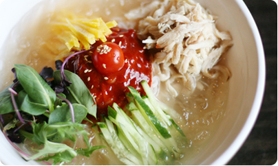 매콤한 냉면육수에 봄나물새싹과 닭가슴살이 어우러진 여름별미 쌀국수